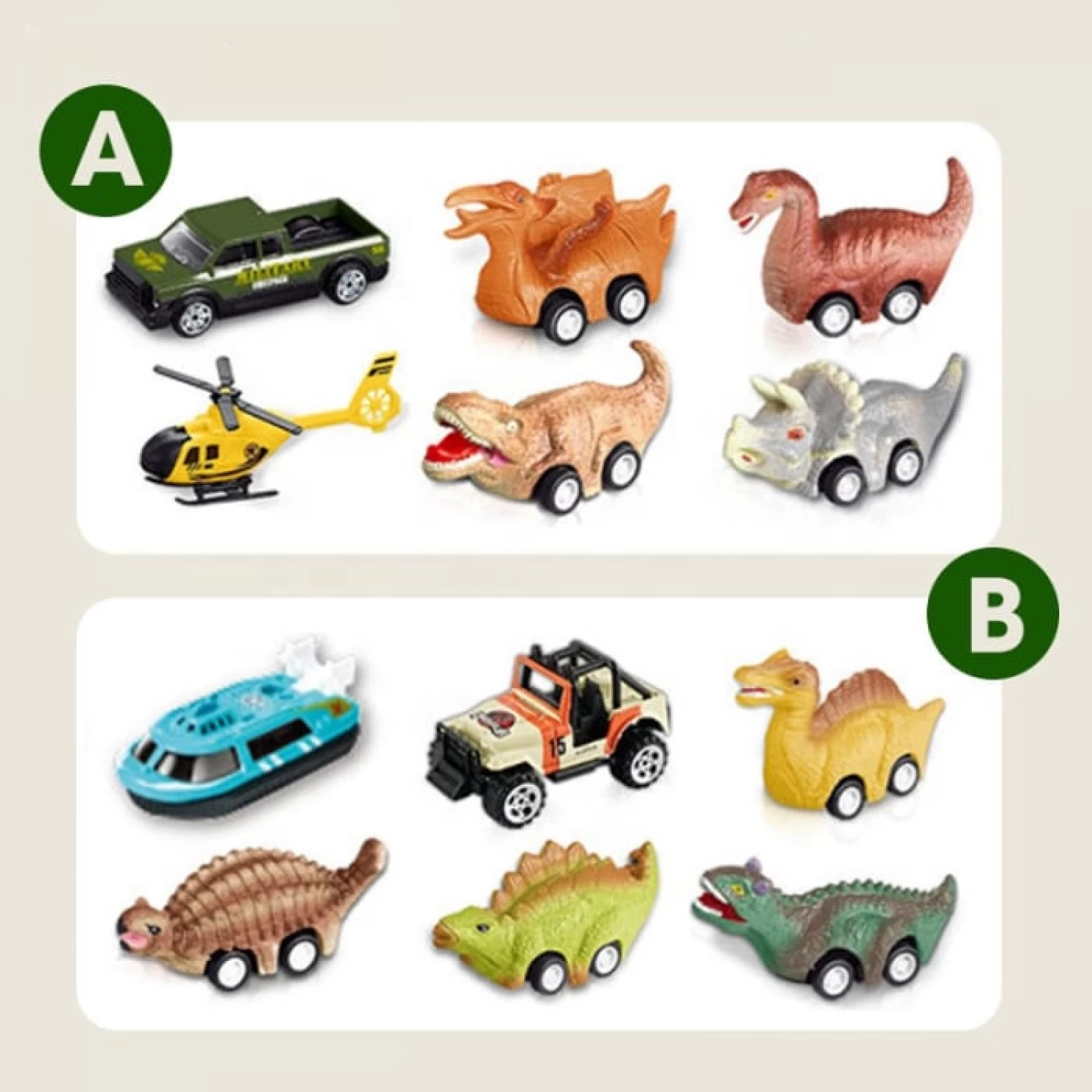 6 × pull-back jármű (A vagy B csomag: jeepek, pick-up, helikopter és dinoszauruszok)