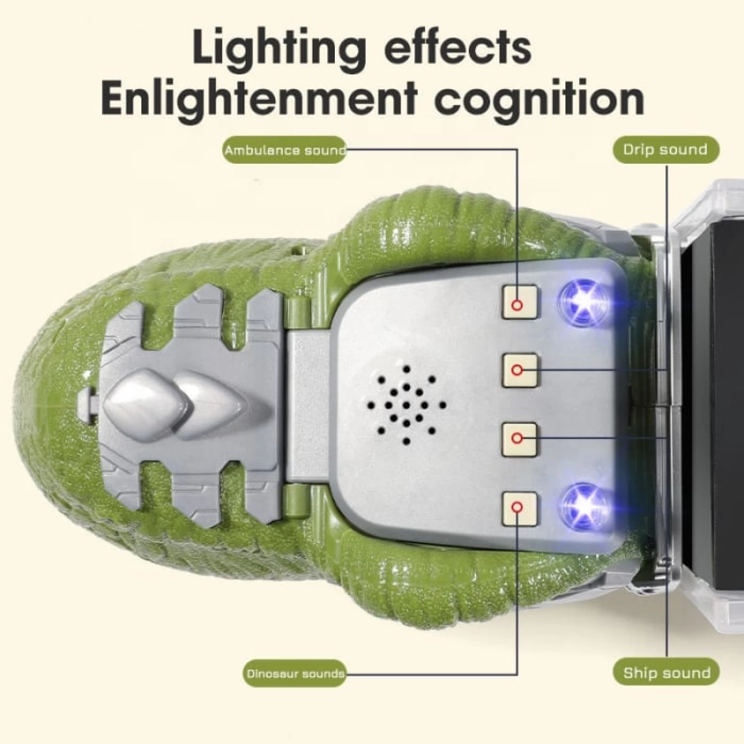 Interaktív hangfunkciók – 4 gomb különböző effektekkel: valósághű dinoszaurusz hang, mentőautó, motor, űrhajó.