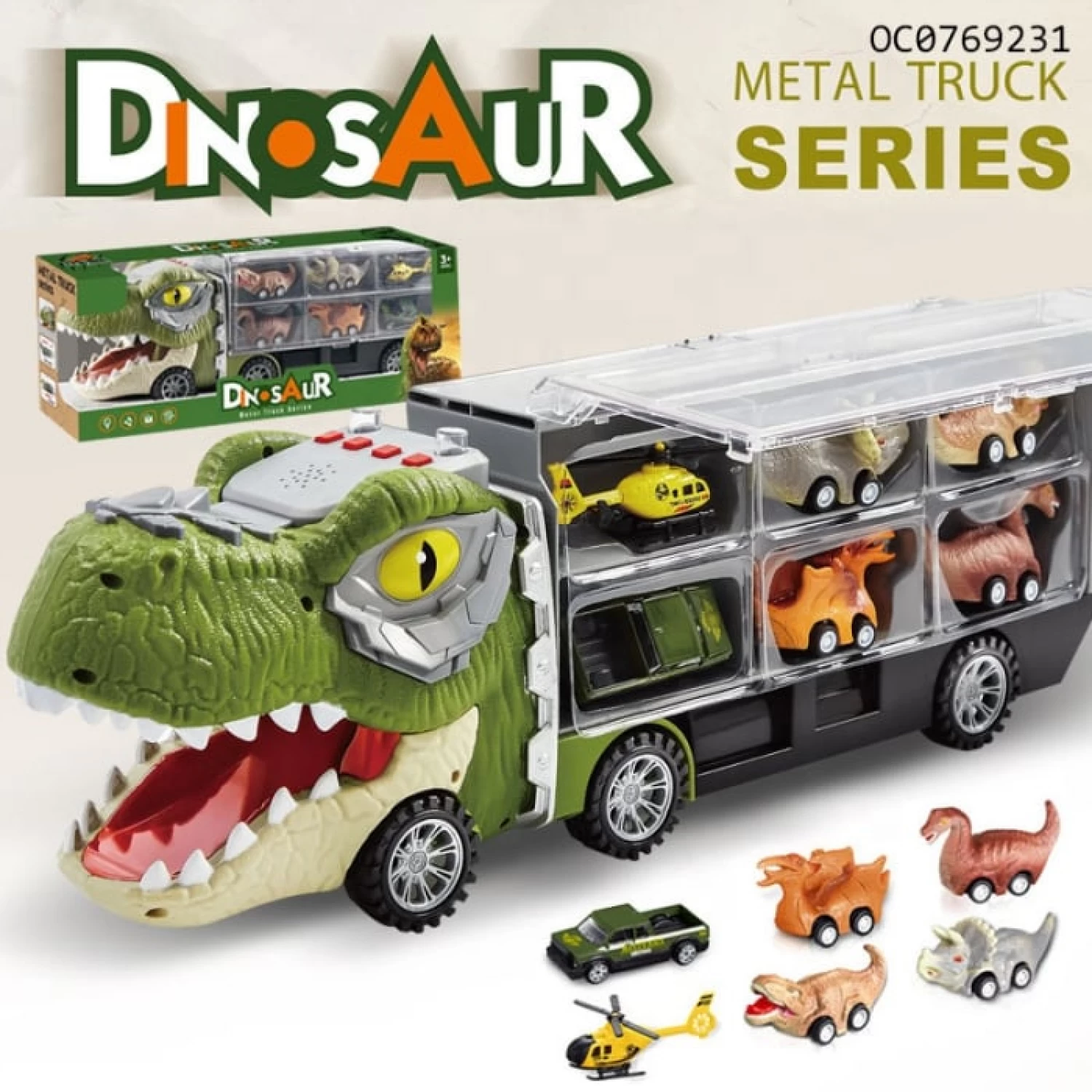 Teljes játék készlet – 1 dinoszaurusz teherautó + 6 tematikus pull-back jármű.
