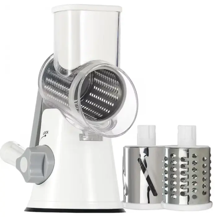 Kézi hajtású reszelő élelmiszeripari 430-as rozsdamentes acélból, 3 cserélhető penge, szeletelés, aprítás és reszelés, tapadókorongos rögzítés, biztonságos és ergonomikus