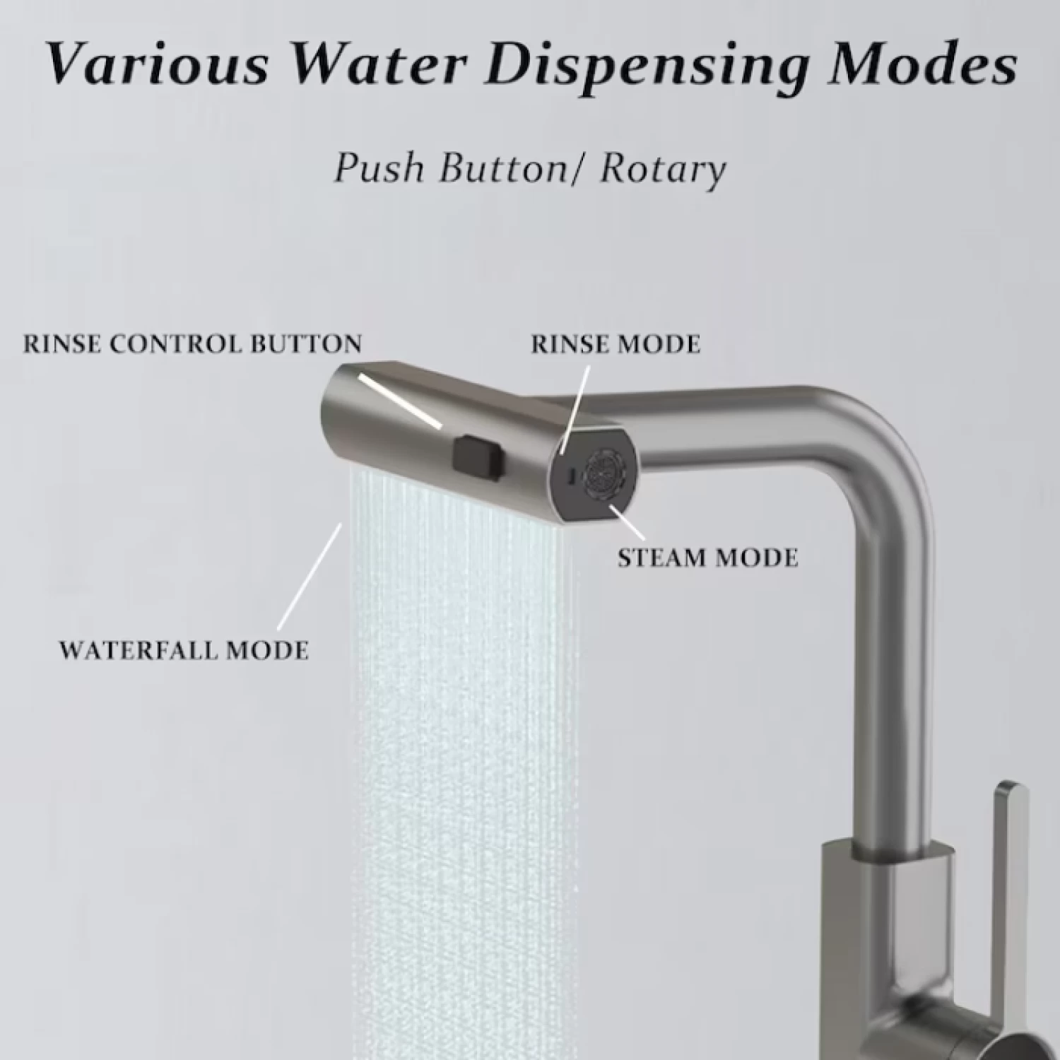 3 vízmód – vízesés gyors edényfeltöltéshez, klasszikus sugár napi használatra, és permetező mód az edények és élelmiszerek hatékony öblítéséhez.