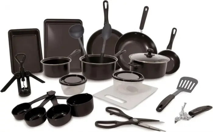 A 22 darabos konyhai készlet, elegáns fekete színben készült, az ideális megoldás a modern konyha teljes felszerelésére. A mindennapi főzési igények kielégítésére tervezett készlet egy csomagban tartalmaz edényeket, serpenyőket és alapvető konyhai eszközöket, tökéletes egyensúlyt biztosítva a hasznosság, tartósság és a kifinomult dizájn között.