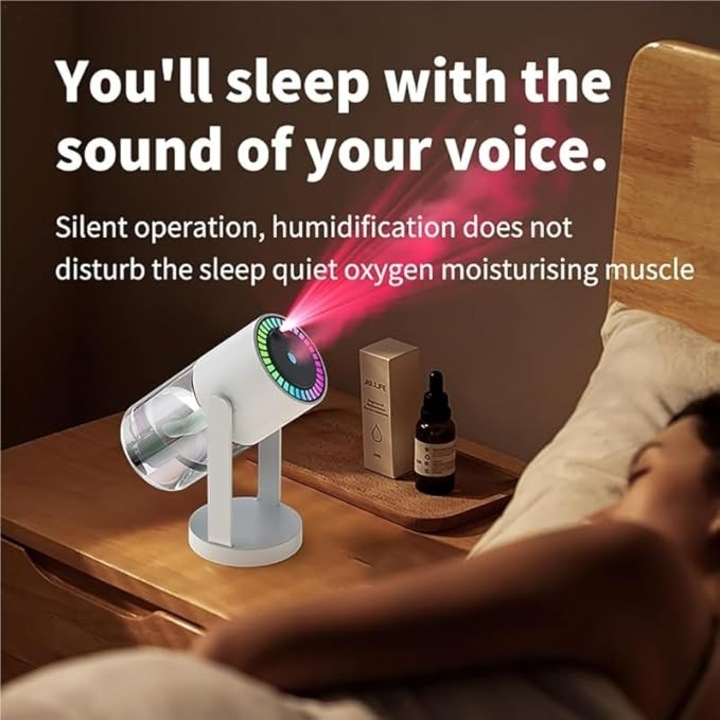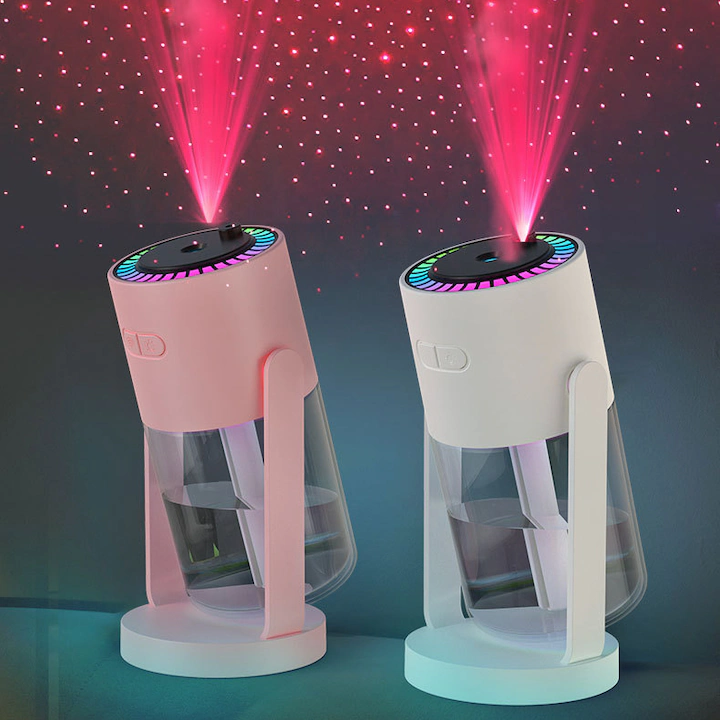 A 280 ml-es hordozható párásító kellemes és nyugtató légkört teremt otthon vagy munkahelyen. A beépített csillagos égbolt vetítés hangulatos fényhatást biztosít, amely ideális pihenéshez vagy esti relaxációhoz.