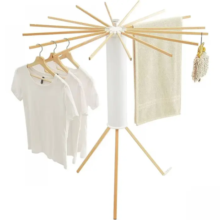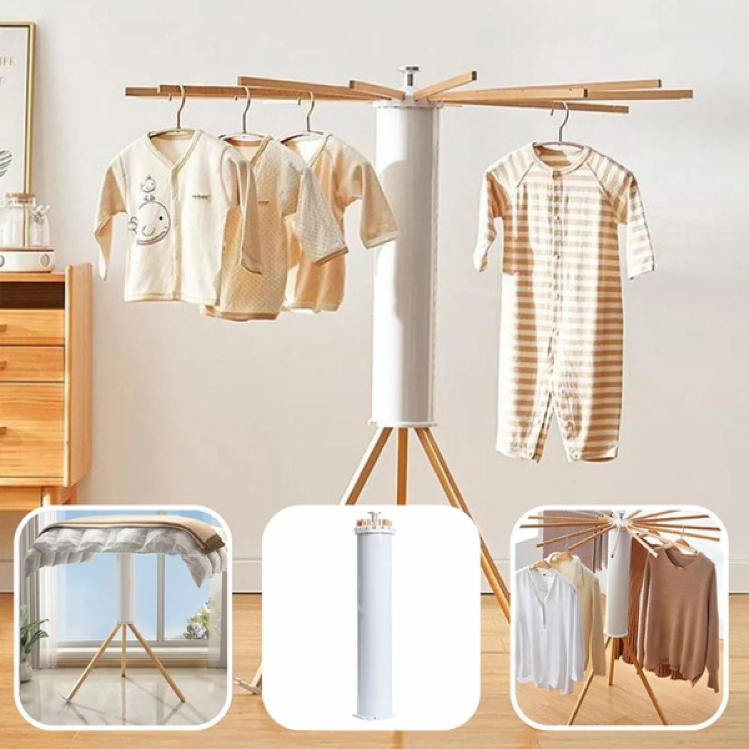 Összecsukható Fa Ruhaszárító – 12 Rúd, 360°-ban Forgatható, Állítható, UV-védelemmel, Kompakt és Tartós