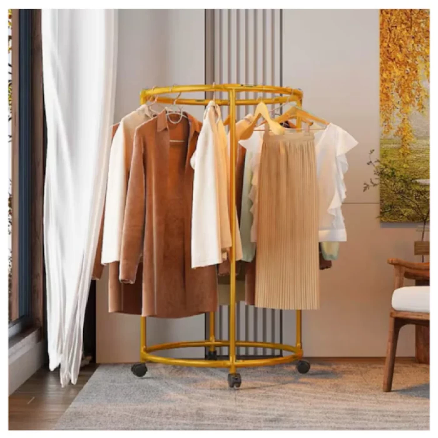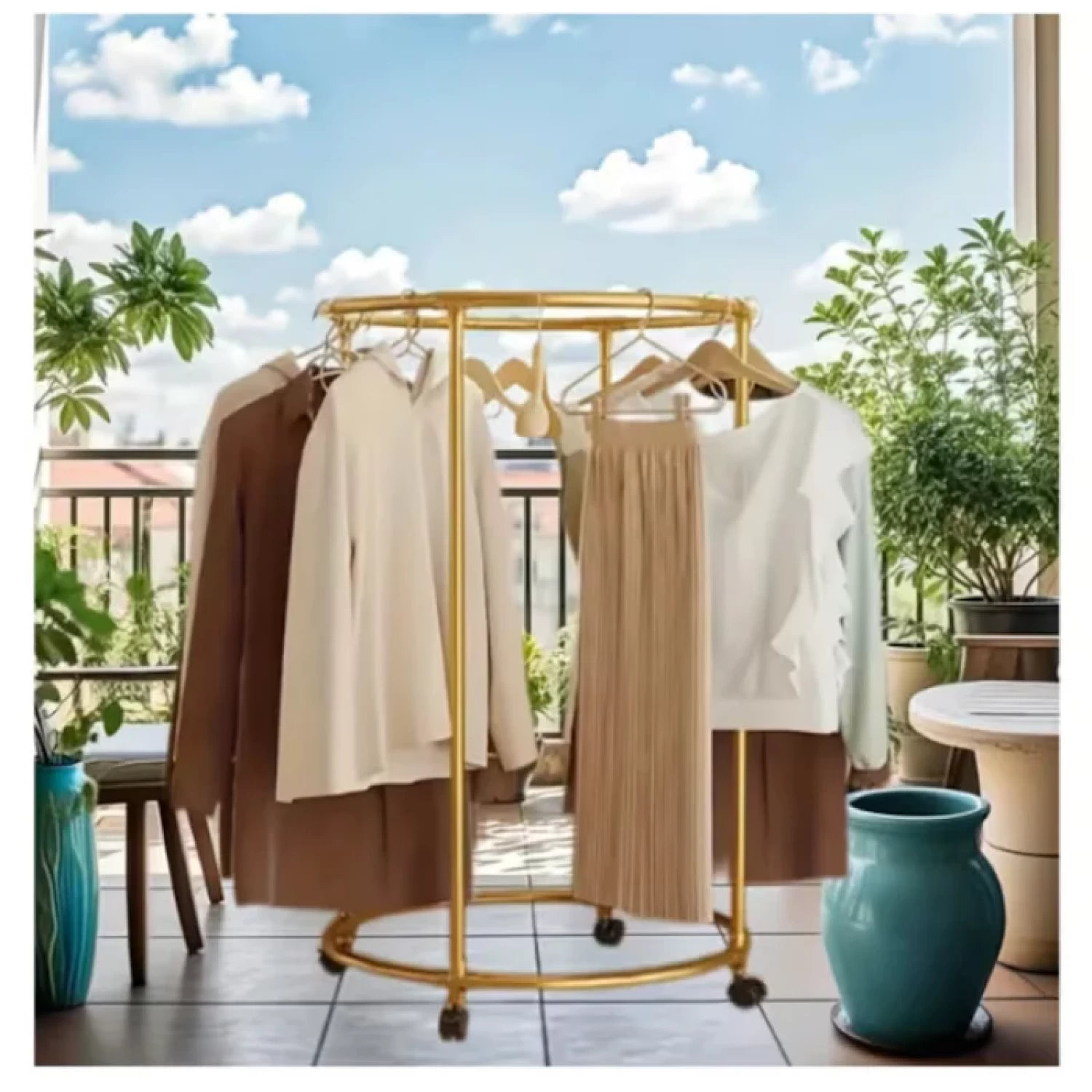 Ez az elegáns arany kerek ruhatartó ideális megoldás a ruhák praktikus és esztétikus rendszerezésére. A kör alakú kialakítás és a 130 cm hosszú rúd lehetővé teszi, hogy minden ruhadarab könnyen hozzáférhető és jól látható legyen, így tökéletes választás otthoni, üzleti vagy bemutatóhelyiségekbe.