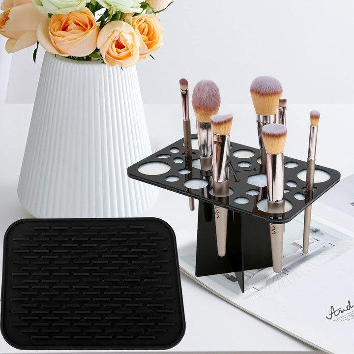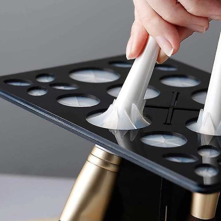 Ez a 28 nyílással ellátott sminkecset tartó ideális megoldás a kozmetikai eszközök rendezett és higiénikus tárolására. Az összecsukható kialakítás helytakarékos, miközben könnyű hozzáférést biztosít minden ecsethez.