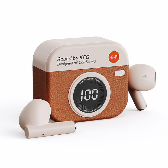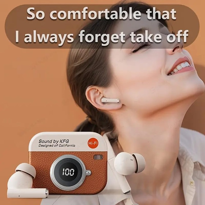 Ez a retro stílusú vezeték nélküli fülhallgató egyedi megjelenésével és modern technológiájával tűnik ki. A kamera ihlette dizájn és a narancssárga szín különleges megjelenést biztosít, miközben a Bluetooth 5.4 és az aktív zajszűrés kiváló hangélményt garantál.